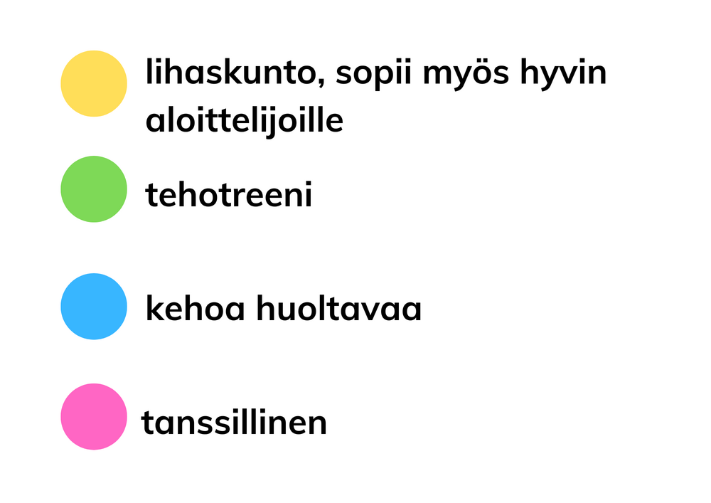 Aikuisten tunneille tarvitset mukaan oman jumppapatjan sekä juomapullon. Suosittelemme myös oman kuminauhan hankkimista.