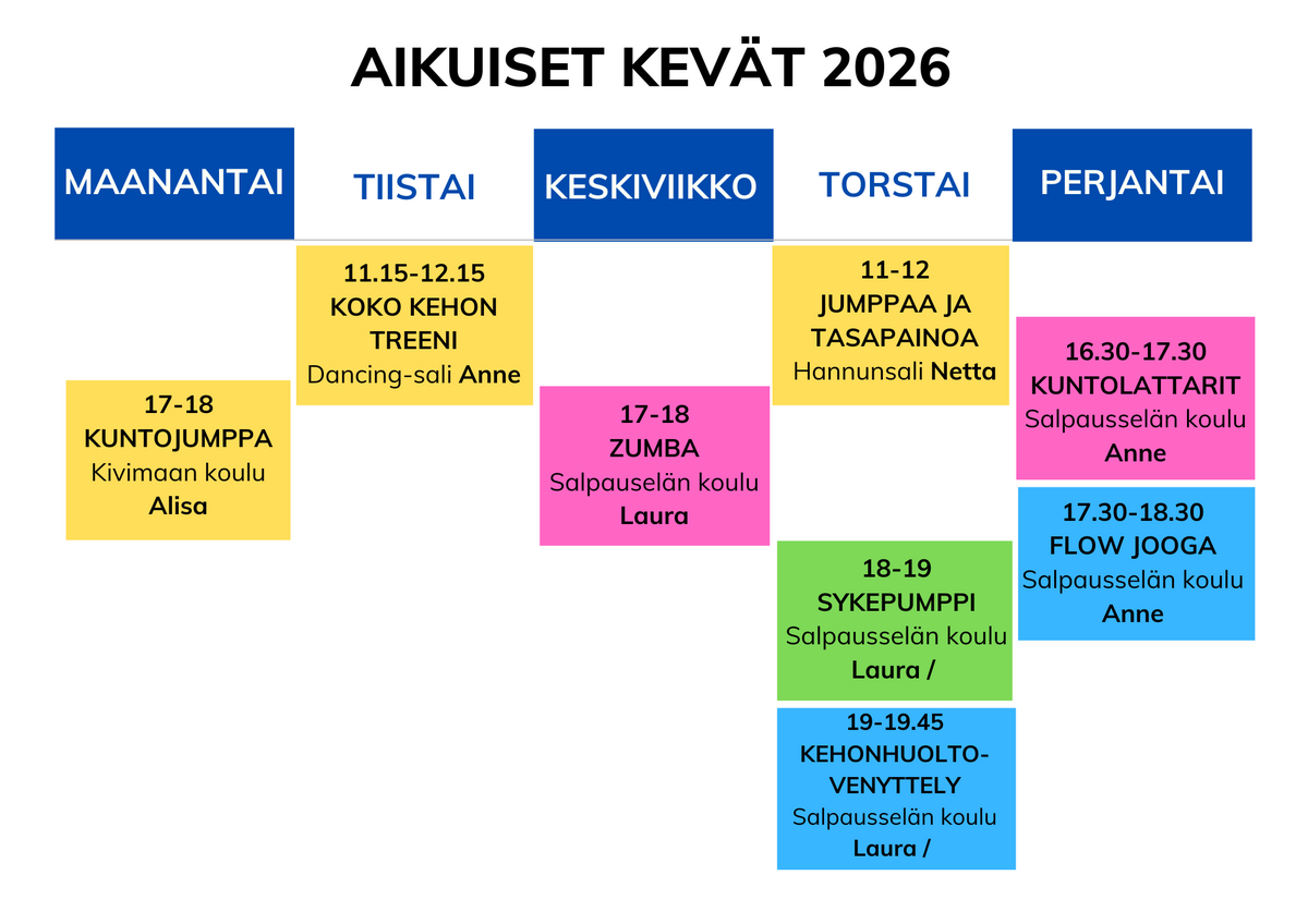 Kausimaksulla pääsy kaikille aikuisten lukujärjestyksestä löytyville tunneille.